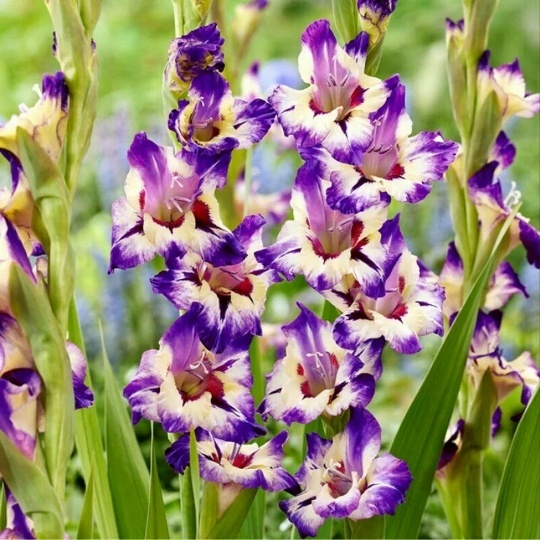 Гладиолус "Циркус Колор" - высота растения 80-110 см. Цветы крупные, яркие, с атласными лепестками. Основная окраска кремовая с ярким винным мазком. Края обрамлены широкой фиолетово-голубой каймой.