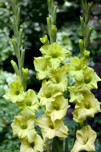 Гладиолус Dingedong – роскошный сорт с крупными цветами зеленого цвета, более насыщенный оттенок по краям немного светлеет к середине, из которой виднеются белые пестики. Элегантные и мощные цветы вырастают до 1,5 м высотой, а раскрытые цветы достигают 15 см в диаметре.