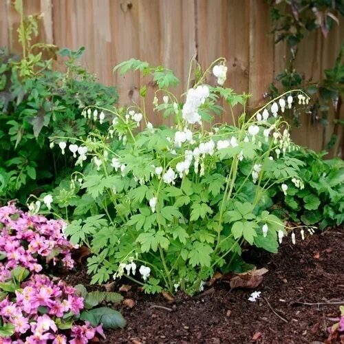 Дицентра великолепная Alba (Dicentra spectabilis 'Alba') — это изысканный сорт дицентры, также известной как "разбитое сердце". Этот сорт отличается своими чисто-белыми цветами, которые напоминают маленькие сердечки, свисающие на изящных стеблях. Цветение: Чисто-белые цветы в форме сердечек, свисающие на изогнутых стеблях. Цветение длится с мая по июнь. Устойчивость: Растение морозостойкое, предпочитает полутень и влажные, хорошо дренированные почвы.