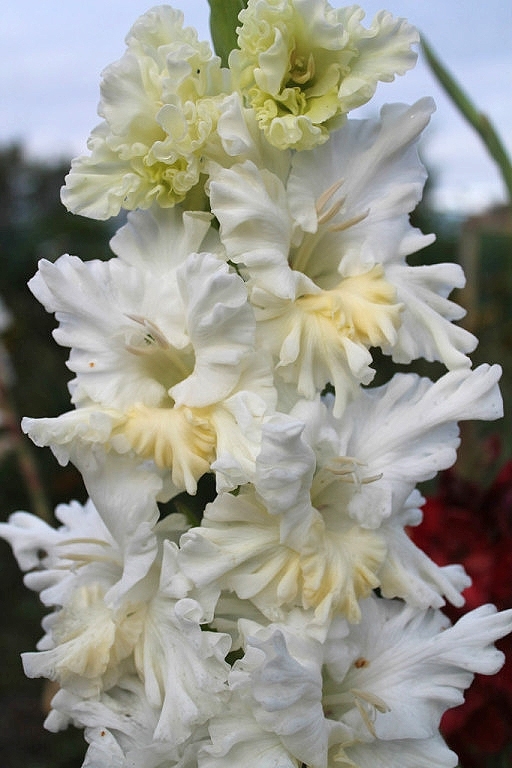 Gera Summum. Гладиолусы ГОФРИРОВАННЫЕ. Размер 10/12. Белоснежный цветок с нежными сильно-гофрированными лепестками. Центр каждого цветка имеет бледно-желтый оттенок. Высота растения - 90- 100 см.