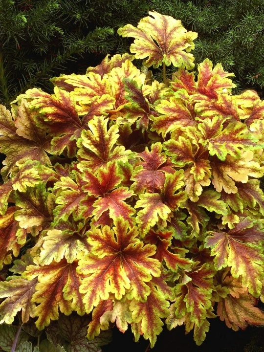 Гейхерелла Голден Зебра – низкорослое многолетнее растение с пестрыми эффектными листьями. Гибрид получен селекционером Э. Лемуаном из Франции в 1912 году на основе двух декоративных растений – тиареллы и гейхеры. Листья кустика не просто яркие, они имеют контрастные полосы по контуру прожилок, поэтому название вида дополнено словом «зебра». Гейхерелла получила награды за декоративность и сегодня украшает сады многих стран мира.