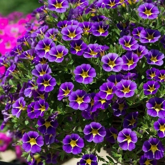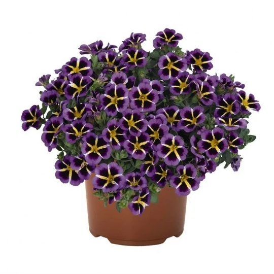 Сорт калибрахоа Тик Ток Блю, также известный как Tik Tok Blue, представляет собой обильноцветущий куст с плотной и компактной структурой. Этот среднерослый сорт отличается полуампельным типом роста побегов, что делает его идеальным для создания красивых композиций в саду или на балконе. Листья растения имеют длину 3-4 см и окрашены в насыщенный зеленый цвет, что создает контраст с яркими цветами. Цветы калибрахоа крупные, диаметром около 3 см, имеют форму граммофончика. Они фиолетовые с темным глазом и белой звездой. Период цветения длится с мая по сентябрь, а при благоприятных условиях может продолжаться до октября. Это делает калибрахоа Тик Ток Блю привлекательным выбором для тех, кто хочет наслаждаться яркими красками на протяжении всего теплого сезона. Цветы распускаются обильно и создают эффектное зрелище.