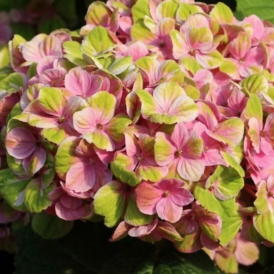 Гортензия крупнолистная Magical Coral - в течение всего периода цветения окраска цветков постоянно меняется. Вначале они бледно-зелёные, затем кораллово-розовые до розовых с фиолетовыми краями, потом цветки становятся зелёными с белыми краями. Цветки собраны в большие соцветия диаметром 20 см, которые отлично подходят для срезки. Куст высотой 100-120 см, шириной 100 см. Побеги толстые, крепкие. Листья тёмно-зелёные. Требуется укрытия на зиму.