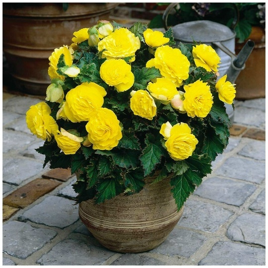 БЕГОНИЯ MULTIFLORA MAXIMA YELLOW-является красивоцветущим гибридным сортом. Высота взрослого растения (куста) достигает 30-40 см в открытом грунте и 25-30 см в горшках, ширина куста составляет 8-12 см. Листья крупные, широкорассеченные, зеленого цвета. Цветки растения крупные (8-10 см в диаметре), махровые, окрашены в ярко-желтый цвет.