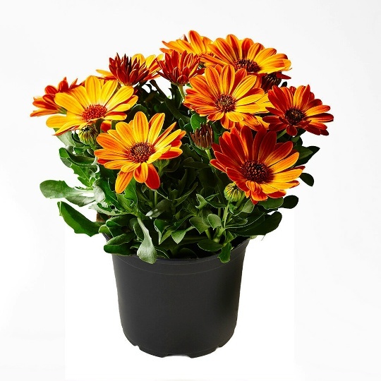 Селекционный прорыв! Потрясающе эффектные компактные крупноцветковые мини-остеоспермумы. Внешне имеют некоторое сходство с ромашками, однако в отличие от последних невероятно обильно цветут большими постоянно обновляющимися цветками 5–6 см в диаметре. За счет плотного, хорошо разветвленного габитуса и жестких побегов кусты отлично держат форму и практически не повреждаются неблагоприятной погодой и вредителями. Цветут без остановки на протяжении всего сезона до самых заморозков. Подходят для выращивания дома и в саду. Рекомендуемый диаметр горшка 10–15 см.