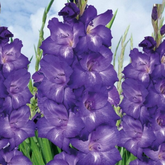 Гладиолус перформер- растение высотой 120-150 см. Цветы крупные, бархатистые, насыщенного сине-фиолетового цвета, с белой полоской в центре соцветия.