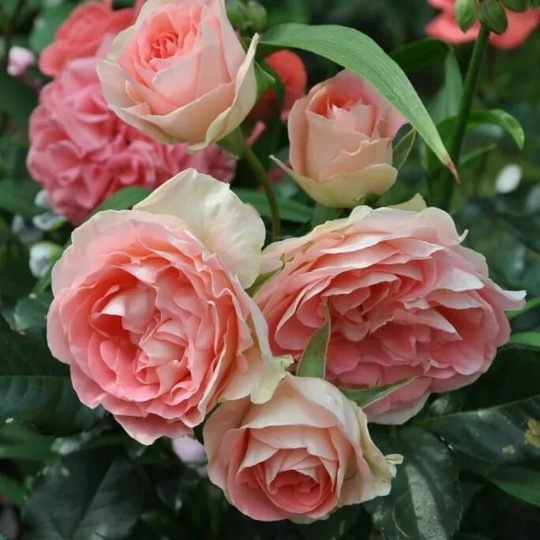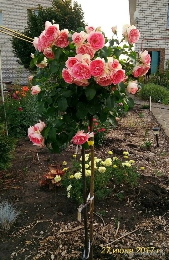 Цветки большие (диаметром 8-10 см), махровые (25-35 лепестков), глубоко чашевидной формы. Насыщенно-розовые поначалу, с возрастом они светлеют. Интенсивность окраски уменьшается к краю. С наружной стороны лепестки белые с легким зеленоватым налетом. Появляются красивыми соцветиями по 3-5 бутонов на одном цветоносе. Аромат лёгкий. Цветение повторное, очень обильное и продолжительное (цветет в течении всего сезона) Сорт морозостойкий с хорошей устойчивостью к заболеваниям.