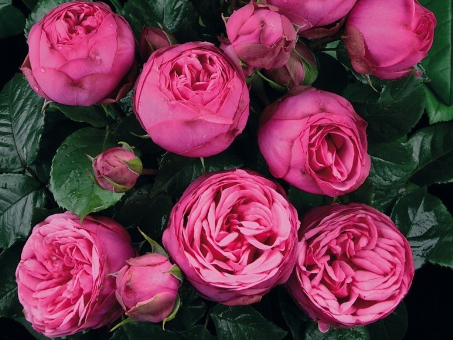 Бутоны розовых оттенков. Цветки средних размеров (6-8 см в диаметре), ярко-розовые, пионовидные, в полураскрытом виде шарообразные, а в распущенном состоянии – чашевидные, с большим количеством красиво оформленных лепесточков классической конфигурации. Тип цветков густомахровый. Растут они одиночно и в соцветиях. Количество цветков на одном стебле – 1-5 штук. Аромат по интенсивности слабый, но устойчивый, с тонким, пикантным малиновым оттенком, достигающий своего максимума в полуденное время. В срезке могут стоять длительное время.