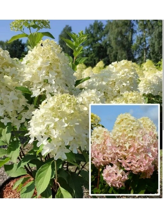 Кустарники компактные, многоствольные. Разрастается гортензия очень быстро, достигая до 120 сантиметров в высоту и 70 сантиметров в диаметре. Побеги расположены вертикально. Окрас листовых пластин сочно-зеленый. Форма листьев продолговатая, эллиптическая. Конические соцветия формируются на верхушках побегов. Из-за крупных размеров соцветий ветки не всегда способны выдержать их вес и наклоняются к земле. Длина соцветия – 30 сантиметров, диаметр – 20 сантиметров. Цвет лепестков зеленовато-белый, который после меняется на белоснежный. С наступлением осени они приобретают розоватый оттенок. В качестве основного цвета выделяют белый. Цветки меняют свой окрас на протяжении всего периода вегетации. Соцветия собраны из стерильных цветков. Плотность – густо набитая. Цветы крупные. Форма гиацинтовидная. Лепестки вытянутые, с загнутыми кончиками. В каждом цветке собрано по 4 лепестка.